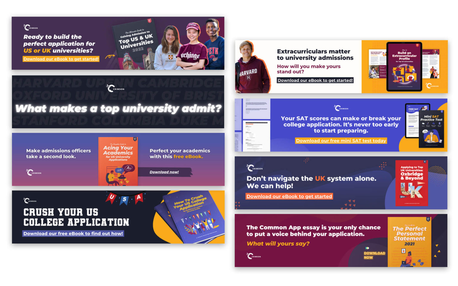 Marketing Materials Crimson Education is a college admissions counselling company helping students gain admission into leading US and UK universities. Here are some marketing materials I designed for them which include ebooks, digital ads, landing pages and banners.